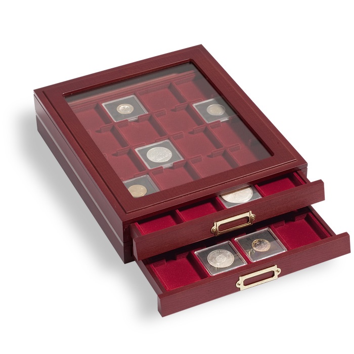 Монетный бокс LIGNUM G на 20 ячеек формата QUADRUM или холдеров, с отделкой под красное дерево, со смотровым стеклом. Leuchtturm. 301258