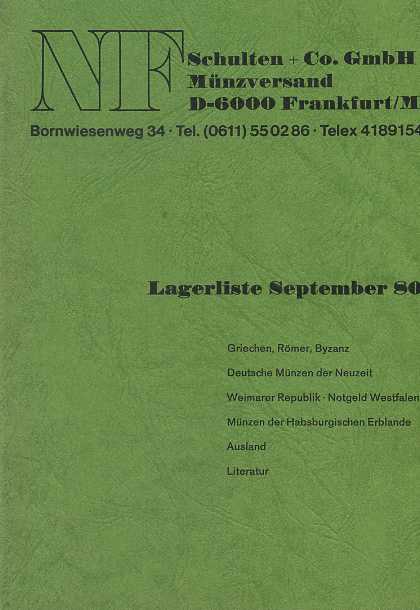 НУМИЗМАТИЧЕСКОЕ ОБЩЕСТВО ШУЛЬТЕН И КОМПАНИЯ ПРАЙС-ЛИСТ ЗА СЕНТЯБРЬ. ГРЕЦИЯ/РИМ/ВИЗАНТИЯ/НЕМЕЦКИЕ СОВРЕМЕННЫЕ МОНЕТЫ/ВЕЙМАРСКАЯ РЕСПУБЛИКА/НОТГЕЛЬДЫ ВЕСТФАЛИИ/МОНЕТЫ НАСЛЕДИЯ ГАБСБУРГОВ/ИНОСТРАННЫЕ МОНЕТЫ/ЛИТЕРАТУРА 1980 NF SCHULTEN + CO GMBH, LAGERLISTE 00-01-06-30