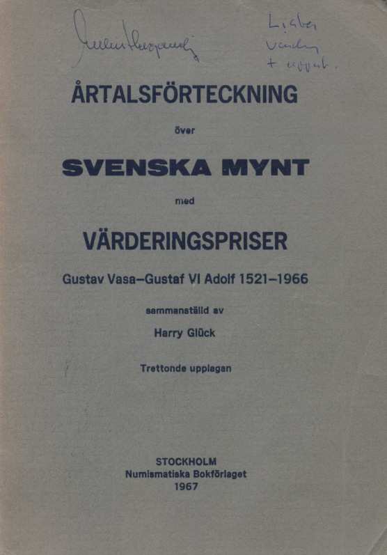ГАРРИ ГЛЮК КАТАЛОГ ШВЕДСКИХ МОНЕТ ОТ ГУСТАВА I ВАЗЫ ДО ГУСТАВА VI АДОЛЬФА 1521-1966 + ОЦЕНКА 1967 HARRY GLUCK, ARTALSFORTECKNING OVER SVENSKA MYNT MED VARDERINGSPRISER GUSTAV VASA - GUSTAF VI ADOLF 1521-1966, 132 СТРАНИЦЫ шведский 00-01-14-05