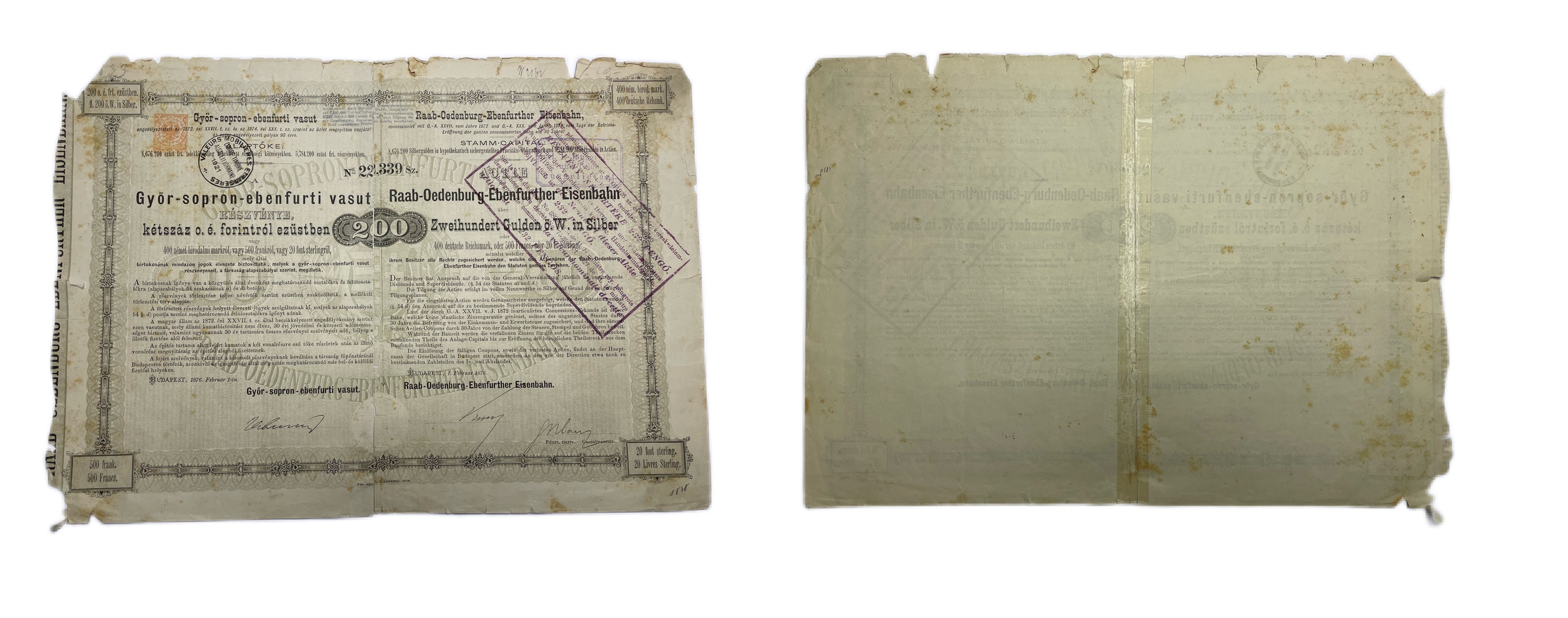 Нидерланды, Raab-Oedenburg-Ebenfurther Eisenbahn акция в 200 гульденов 1876 бумага 5548-86-1-2