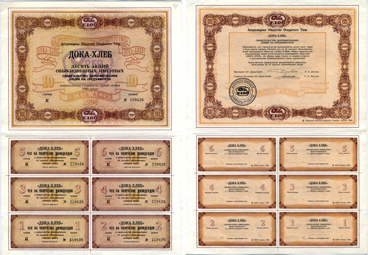 Акционерное общество открытого типа ДОКА-ХЛЕБ 10 акций обыкновенных именных стоимость 1000 рублей 1994 бумага aUNC 6207-7-1-2