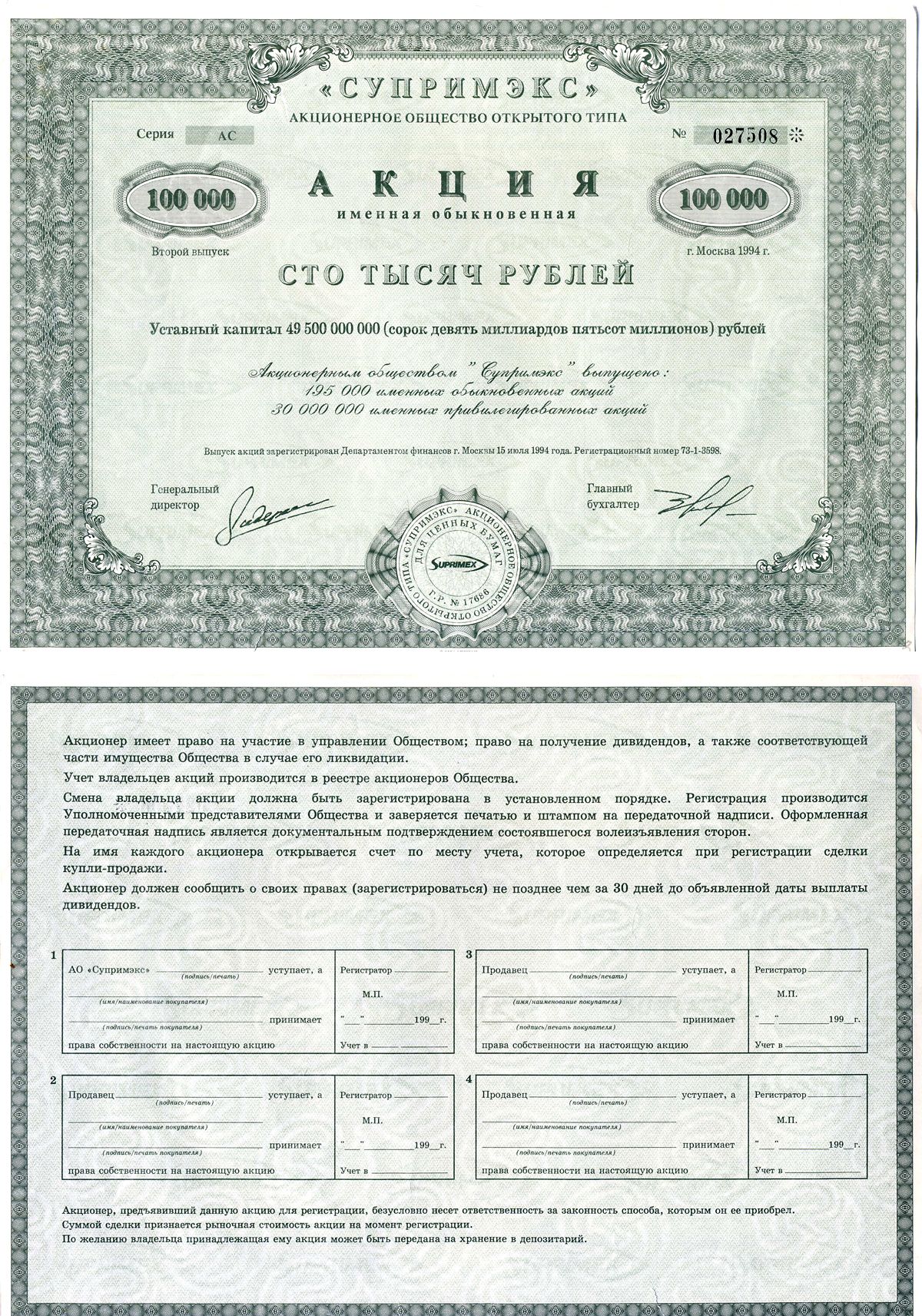 Акционерное общество открытого типа "Супримэкс" (Супримекс) акция именная обыкновенная 100000 (сто тысяч) рублей 1994 бумага 6207-23-1