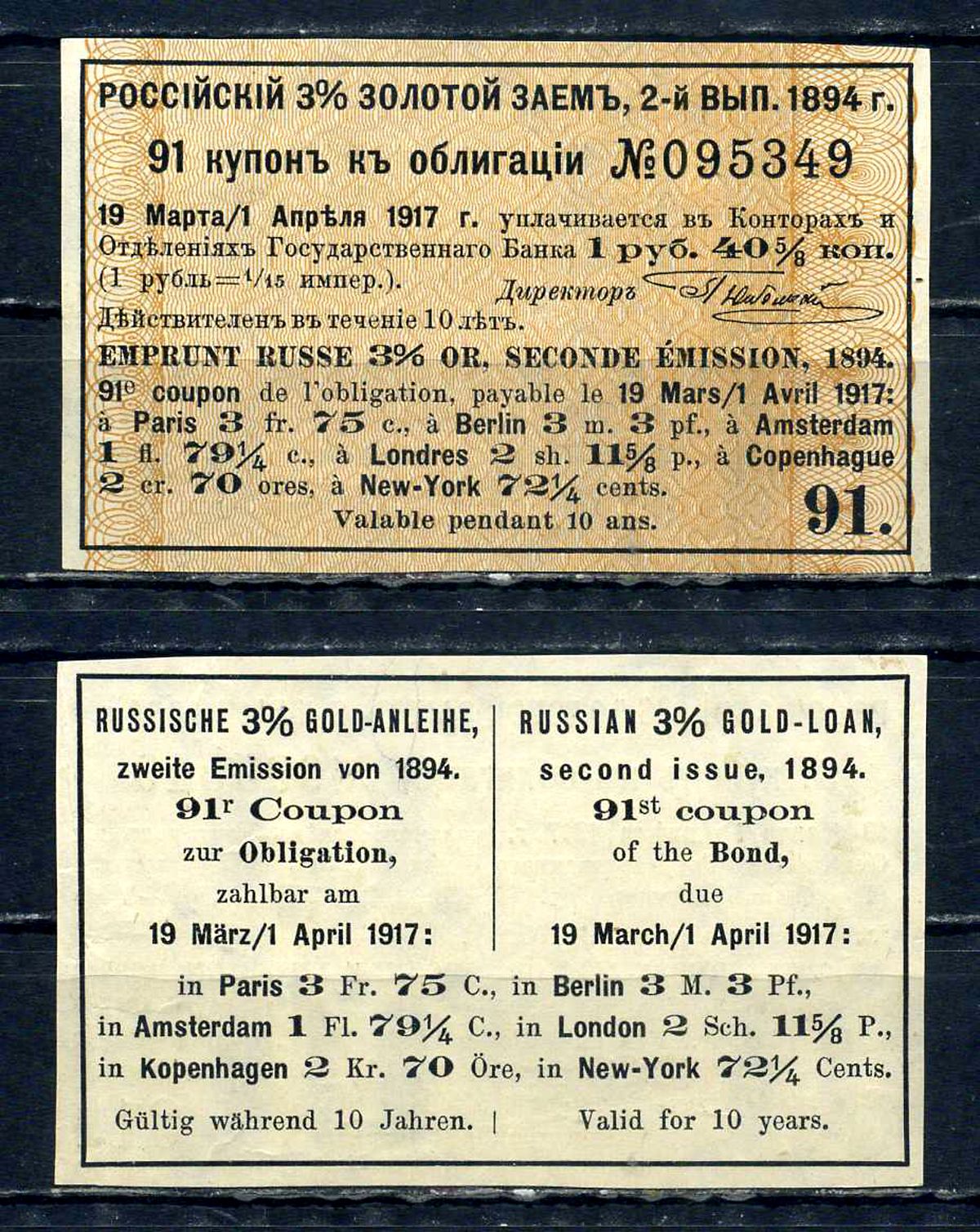 Россия, Золотой заем купон от 3% облигации на выплату 1 рубль 40 5/8 копеек (2-ой выпуск) 1894 выплата за 1917, Суррогаты денежных знаков Сенкевич 268 бумага aUNC 8614-80-3-2