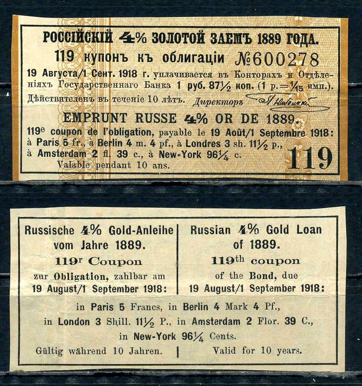 Россия, Золотой заем купон от 4% облигации на выплату 1 рубль 87 1/2 копейки 1889 бумага 8614-79-1-1