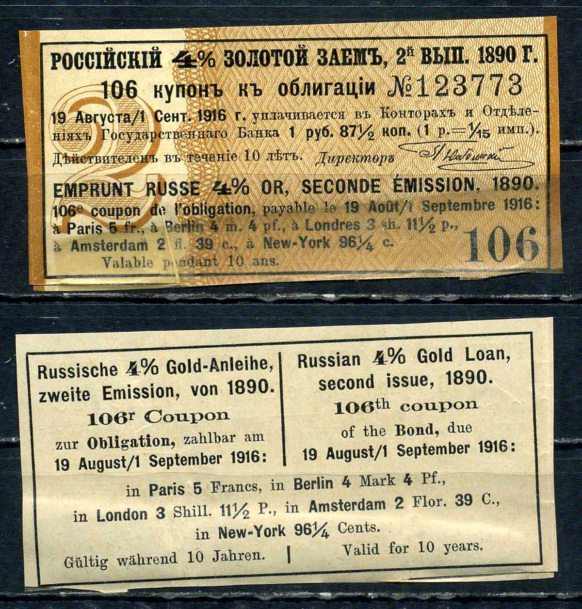 Россия, Золотой заем купон от 4% облигации на выплату 1 рубль 87 1/2 копейки (2-ой выпуск) 1890 выплата за 1916, Суррогаты денежных знаков Сенкевич 247 бумага 8614-57-2-1