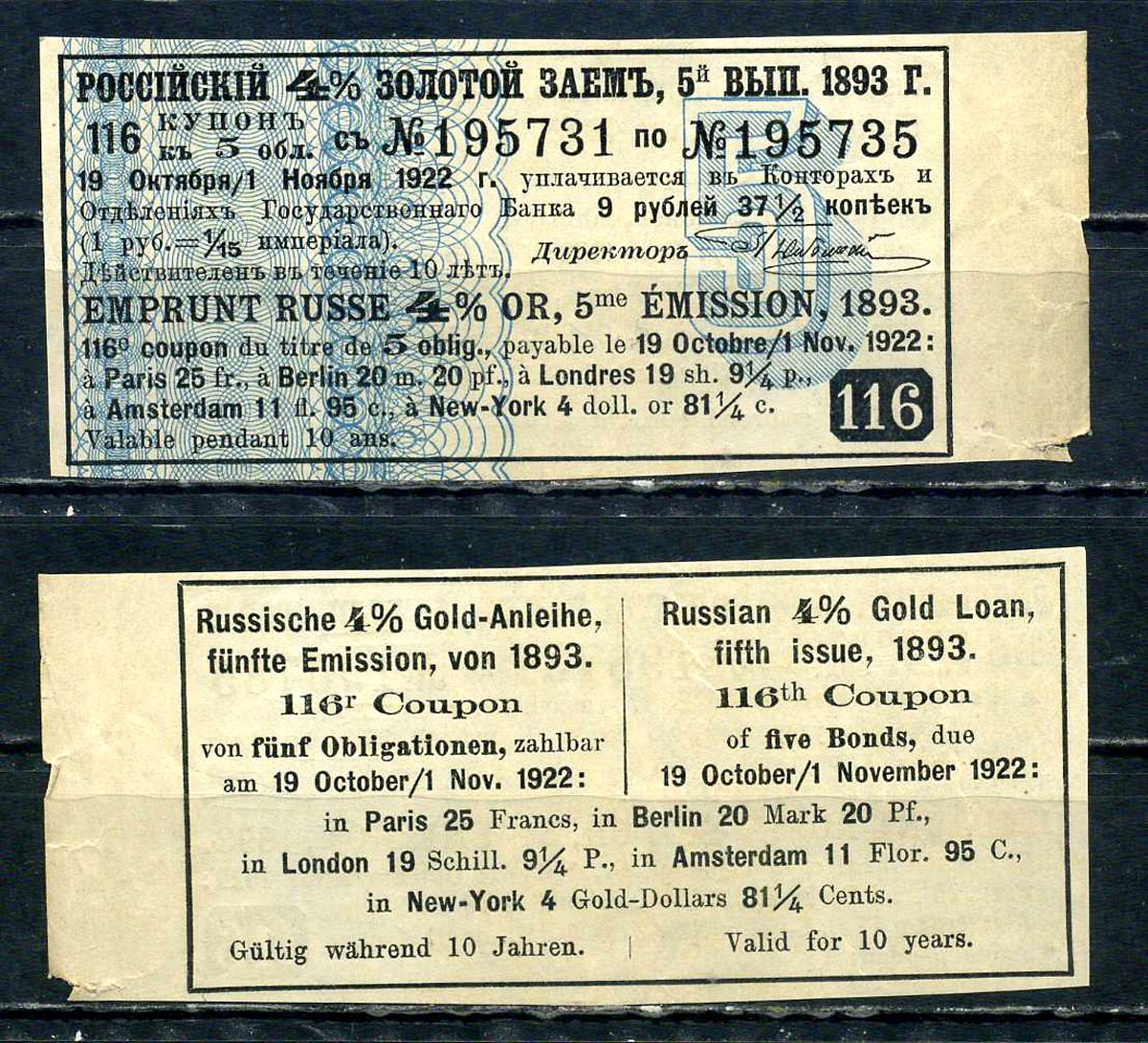 Россия, Золотой заем купон от 4% облигации на выплату 9 рубль 37 1/2 копейки (5-й выпуск) 1893 бумага aUNC 8601-7-2-1