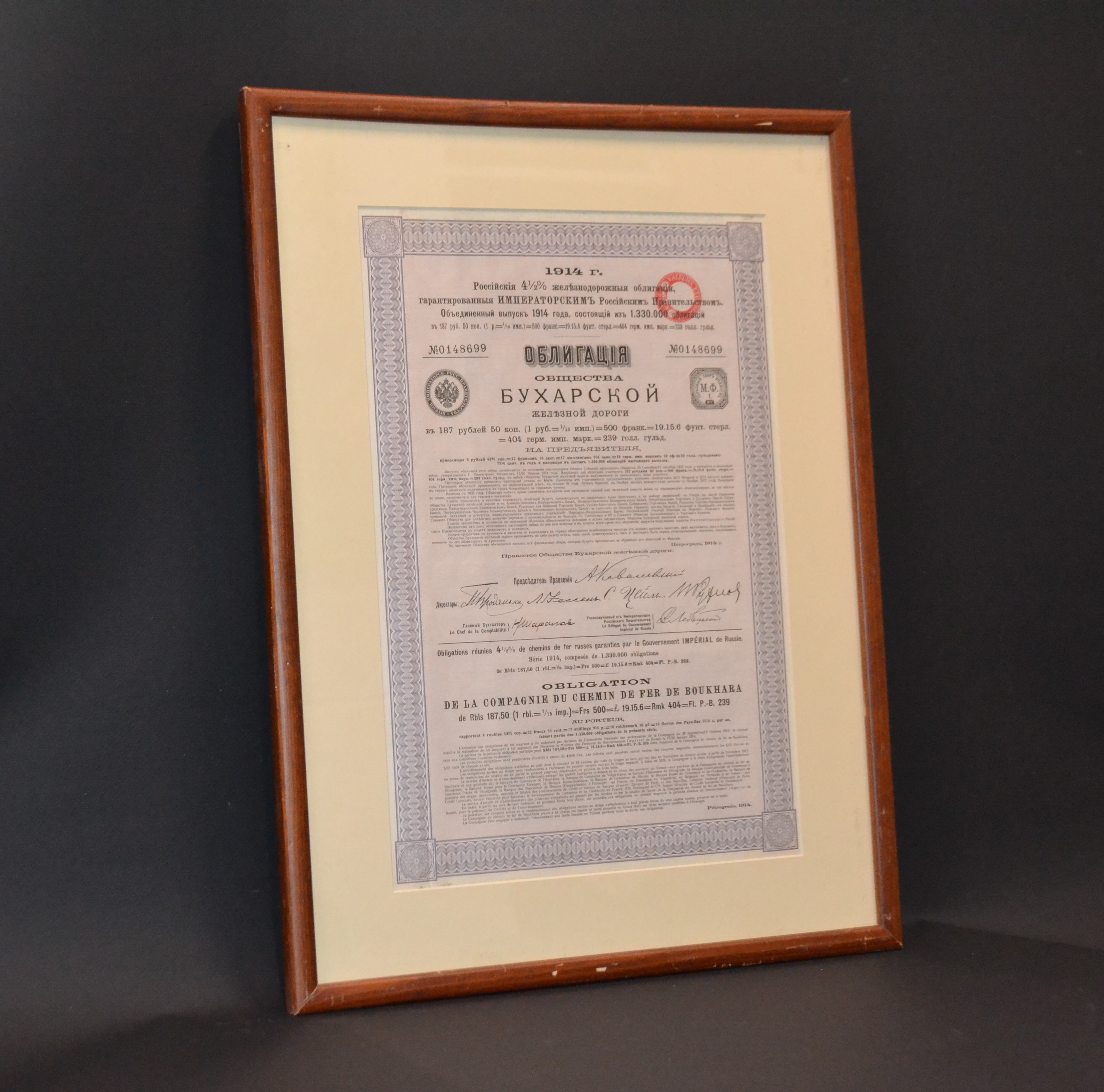 Россия, Общество Бухарской железной дороги 4,5% облигация в 187 рублей 50 копеек 1914 в рамке со стеклом бумага 57-1-02