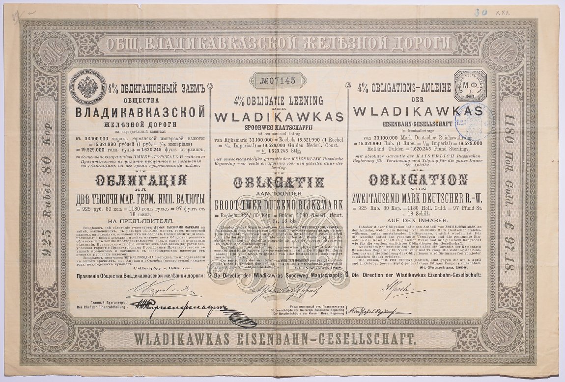 ОБЩЕСТВО ВЛАДИКАВКАЗСКОЙ ЖЕЛЕЗНОЙ ДОРОГИ ОБЛИГАЦИЯ НА 2000 МАРОК ГЕРМАНСКОЙ ИМПЕРИИ, СЕРИЯ Б 1898 НА ПРЕДЪЯВИТЕЛЯ, 4% ЗАЕМ бумага 5538-13