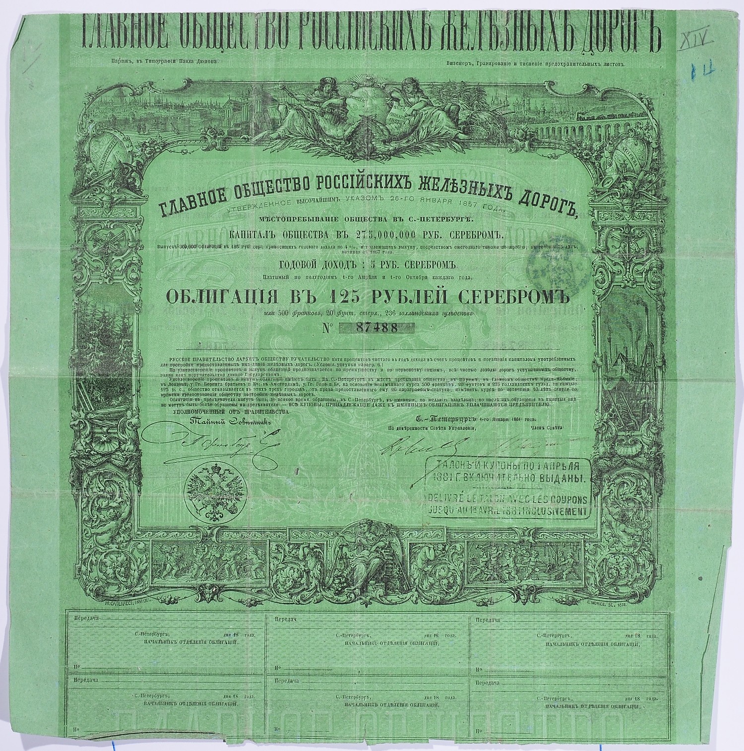 РОССИЯ, ГЛАВНОЕ ОБЩЕСТВО РОССИЙСКИХ ЖЕЛЕЗНЫХ ДОРОГ ОБЛИГАЦИЯ НА 125 РУБЛЕЙ СЕРЕБРОМ 1857 НА ПРЕДЪЯВИТЕЛЯ, 4% ЗАЕМ, С КУПОНАМИ бумага 5540-1