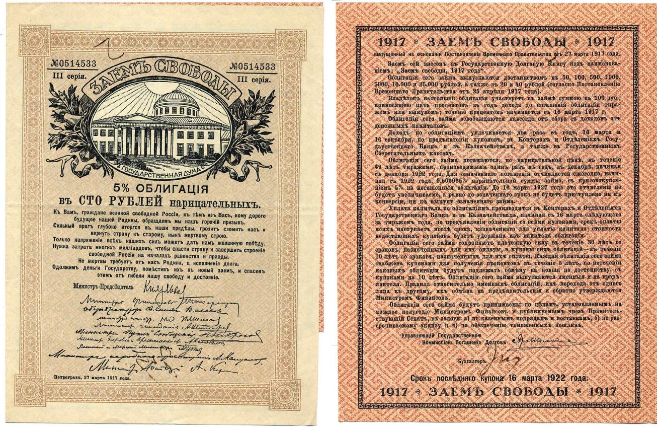 РОССИЯ ОБЛИГАЦИЯ 5% ЗАЙМА СВОБОДЫ 1917 ВЫПУСК ВРЕМЕННОГО ПРАВИТЕЛЬСТВА, III СЕРИЯ, ПЕТРОГРАД 27 МАРТА 1917 ГОДА, С КУПОНАМИ, В ТЕКСТЕ УКАЗАНЫ НОМИНАЛЫ 20 И 40 КОПЕЕК Денисов ЗС-4а бумага XF 439-47-1-2