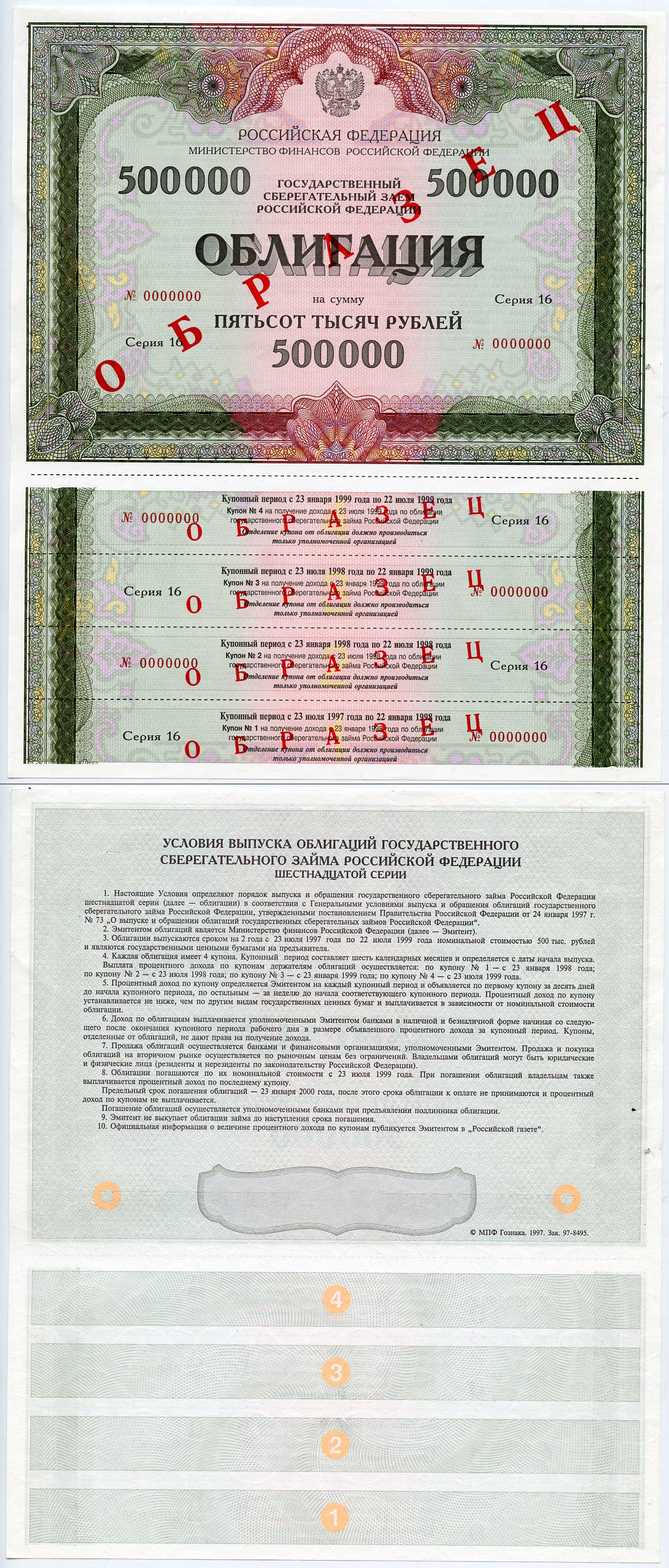 Россия Облигация 500000 рублей 1997 Министерство Финансов Российской Федерации, 16 серия. "Образец" бумага UNC (пресс) 5554-1-1-1