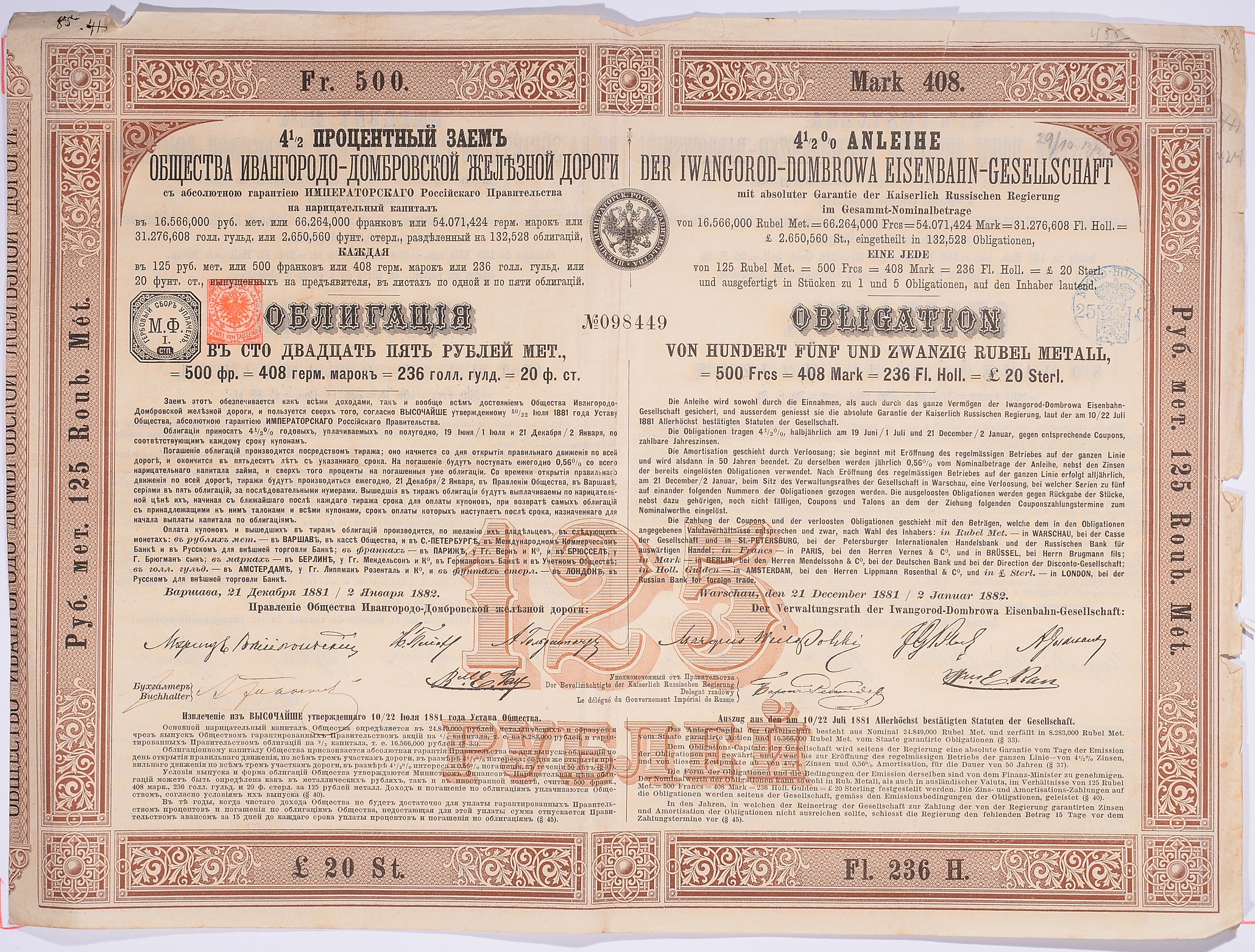 РОССИЯ, ОБЩЕСТВО ИВАНГОРОДО-ДОМБРОВСКОЙ ЖЕЛЕЗНОЙ ДОРОГИ ОБЛИГАЦИЯ НА 125 МЕТАЛИЧЕСКИХ РУБЛЕЙ,РОССИЙСКИЕ ЖЕЛЕЗНЫЕ ДОРОГИ - ШЕСТОЙ ВЫПУСК 1880 НА ПРЕДЪЯВИТЕЛЯ, РОССИЙСКИЙ 4 1/2 % ЗАЕМ бумага 5540-11