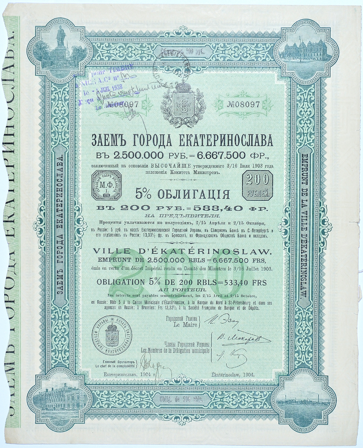 РОССИЯ ЗАЕМ ГОРОДА ЕКАТЕРИНОСЛАВА В 2500000 РУБЛЕЙ 5% ОБЛИГАЦИЯ В 200 РУБЛЕЙ НА ПРЕДЪЯВИТЕЛЯ 1904 бумага 5553-10
