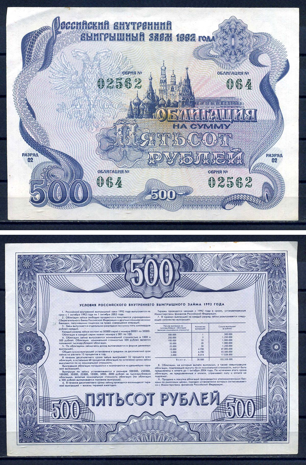 Российский внутренний выигрышный заем облигация на 500 рублей 1992 разряд 002, облигация 064 бумага aUNC 2194-31-1-2