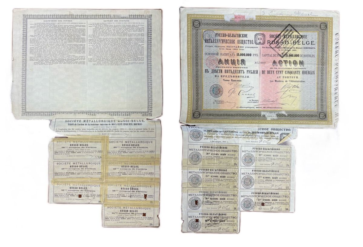 Русско-Бельгийское металлургическое общество акция в 250 рублей 1900 с 1 талоном и 7 купонами бумага 5554-16-1-1
