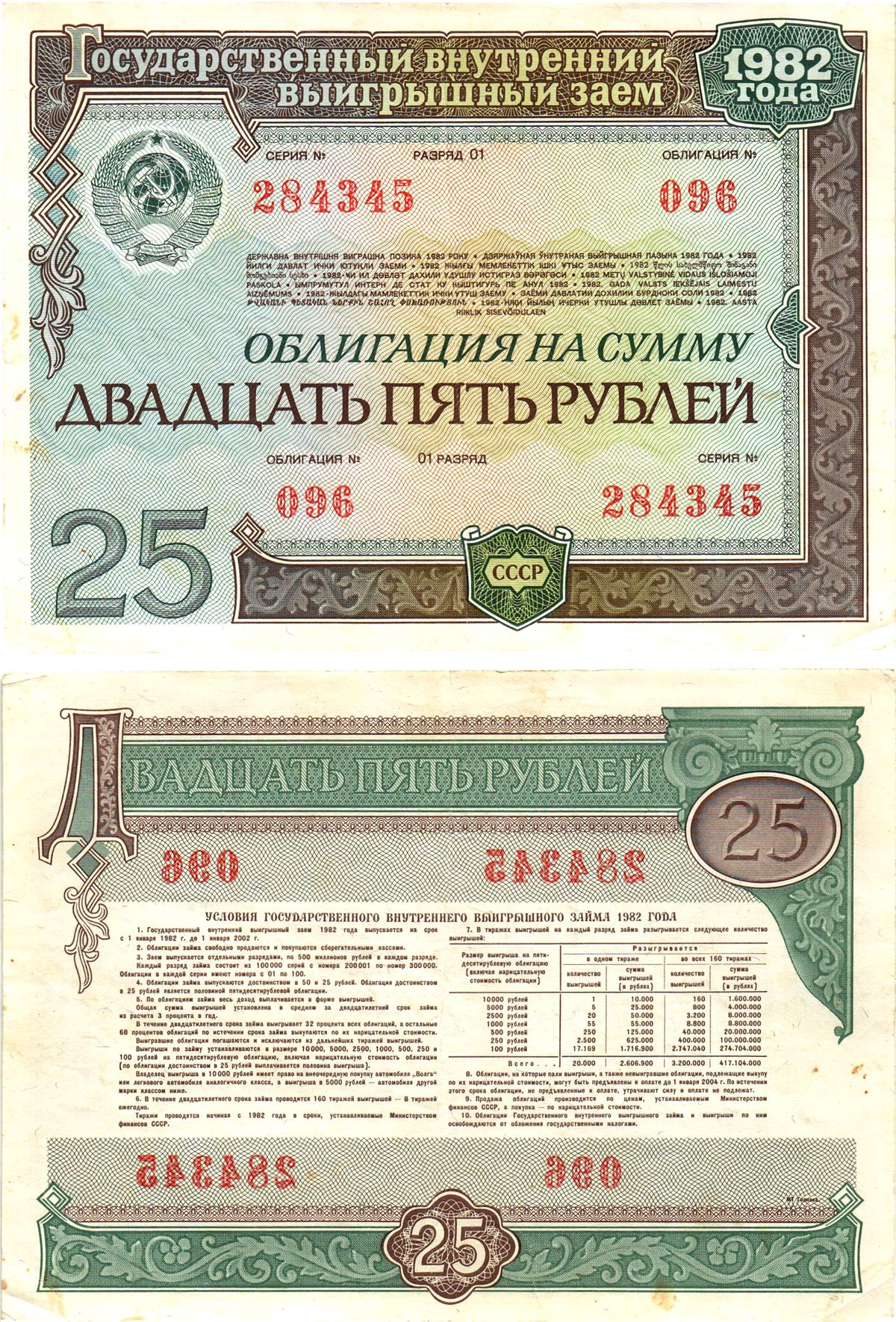 СССР облигация в 25 рублей 1982 государственный внутренний выигрышный заем, разряд 01 бумага 8619-24-2-2