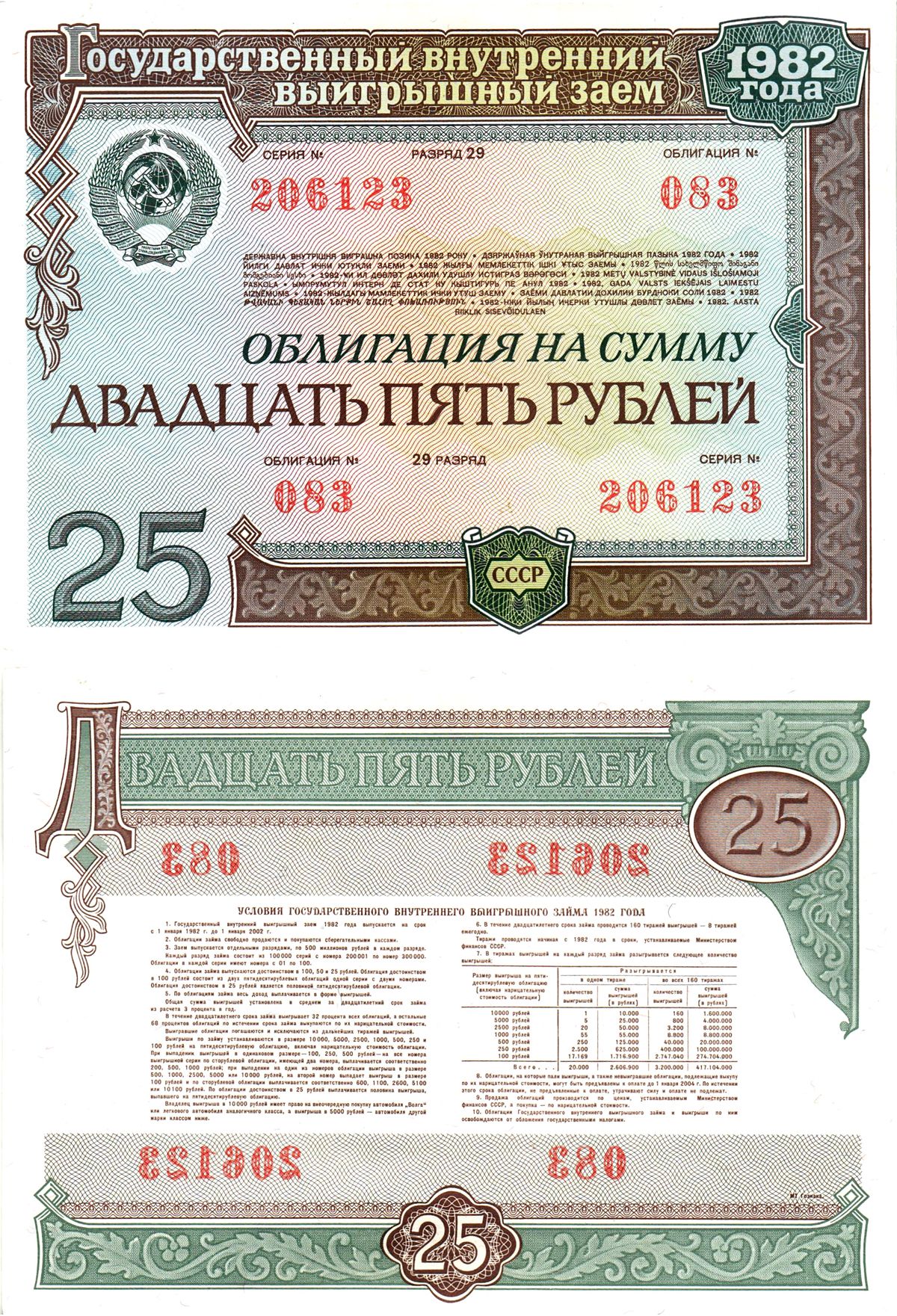 СССР облигация в 25 рублей 1982 государственный внутренний выигрышный заем, разряд 29 бумага aUNC 7215-22-1-2