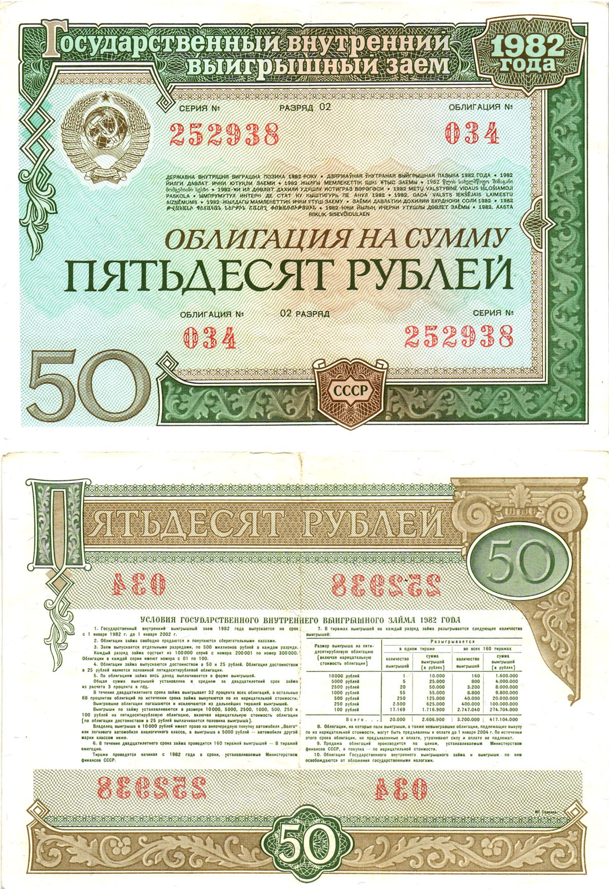 СССР облигация в 50 рублей 1982 государственный внутренний выигрышный заем, разряд 02 бумага 8609-3-1-2