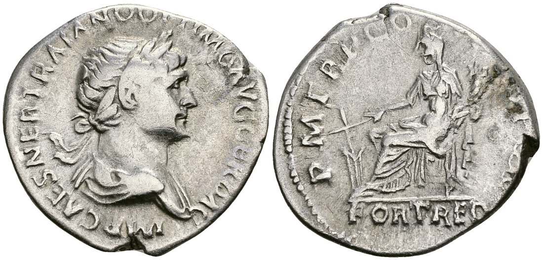 Римская Империя денарий 114 - 117 Траян PM TR P COS VI PP SPQR FORT RED Фортуна, персонификация Удачи Рим Very fine RIC 318 серебро 1073-4-3-2