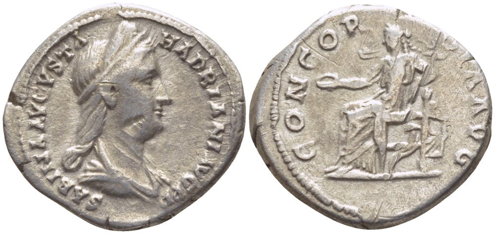 Римская Империя денарий 128 - 136 Сабина, жена АдрианА CONCORDIA AVG Конкордия, персонификация Согласия, Рим Very fine RIC 398 серебро 1073-15-61