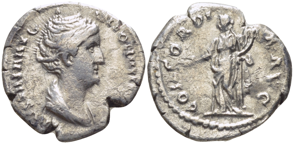 Римская Империя денарий 138 - 139 Фаустина Старшая, жена Антонина Пия CONCORDIA AVG Конкордия, персонификация Согласия, Рим Very fine RIC 329 серебро 1073-15-57