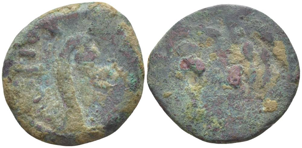 Римская Империя, Провинция Иудея прута 30/31 год император Тиберий, прокуратор Понтий Пилат, греческая легенда 'ТИБЕРИЯ КЕСАРЯ', культовый посох Авгура (lituus) / дата в венке, Иерусалим RPC 4968 медь 1073-21-53