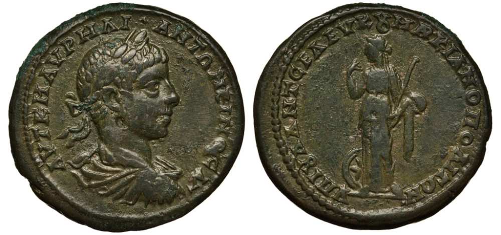 Римская Империя, Провинция Нижняя Мезия, Маркианополь пентассарий 218 - 222 Элагабал, бюст императора / Немезида, 9,51 гр Varbanov 1476 медь 1073-7-65