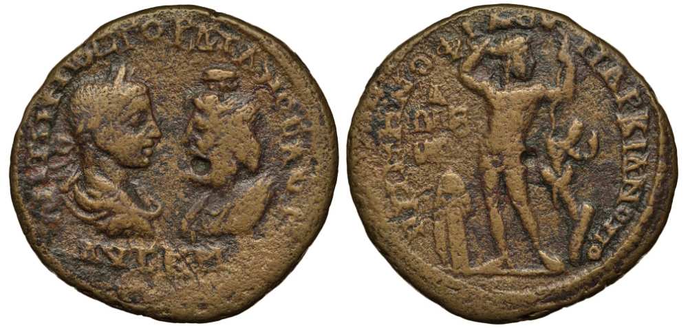 Римская Империя, Провинция Нижняя Мезия, Маркианополь пентассарий 238 - 244 Гордиан III, бюсты Гордиана III и Сераписа / Аполлон держит ветвь со змеем, 10,06 гр SNG Cop. 255 медь 1073-7-44