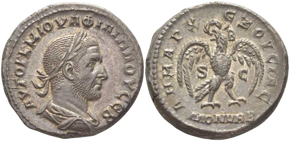 Римская Империя, Провинция Сирия тетрадрахма 245 Филипп I Араб, ?YTOK K M IOY? ?I?I??OY CЕB бюст императора в лавровом венке, обращенный вправо /?HMAPX Е?OYCIAC орел, распростерший крылья, держит в клюве лавровый венок, в поле S C, ниже MON VRB, Антиохия ,