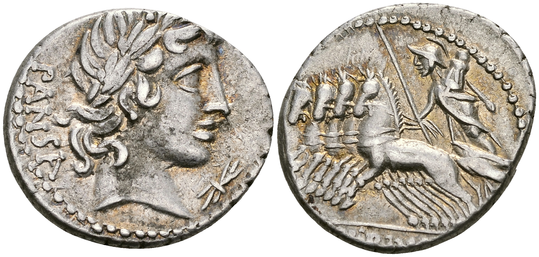 Римская Республика денарий 60 г. до н.э. монетарий Вибий Панса, голова Аполлона / Минерва в квадриге, Рим, 3,90 гр Crawf. 342/4 b; Syd. 685 серебро 1073-5-5-2
