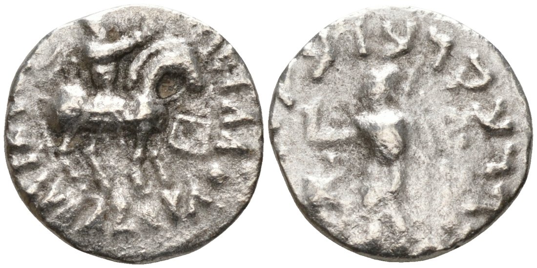 Индо-Скифское царство драхма 58-12 гг. до н.э. Азес, царь верхом на коне, легенда на греческом и на языке харошти/Зевс, держащий Нику и Скипетр, легенда на языке харошти - ВЕЛИКИЙ ЦАРЬ, ЦАРЬ ЦАРЕЙ, АЗЕС ВЕЛИКИЙ Senior 105 серебро 1073-19-92