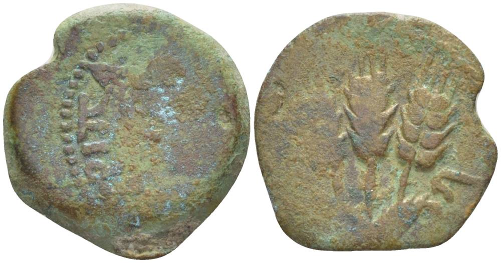 Иудея, династия Ирода прута 41/42 год Агриппа I, греческая легенда 'царь Агриппа', зонт / три хлебных колоса, дата (6-й год правления), Иерусалим Hendin 1244 медь 1073-21-32