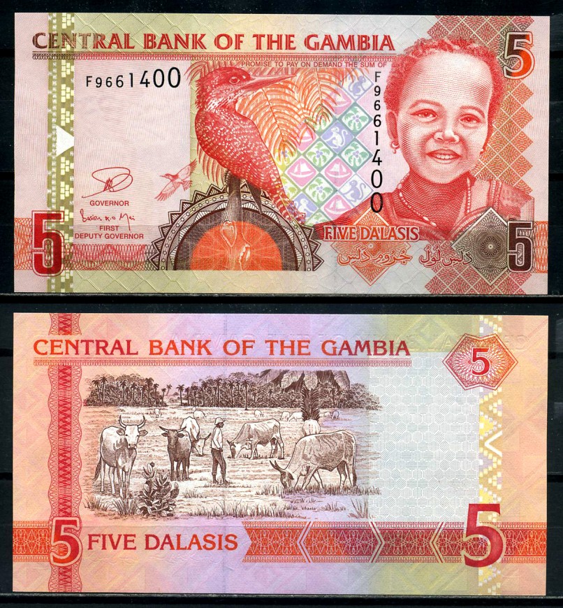 Гамбия 5 даласи ND (2006-2014) Гигантский пегий зимородок, девочка Pick 25 c бумага UNC (пресс) 7486-8-2-1