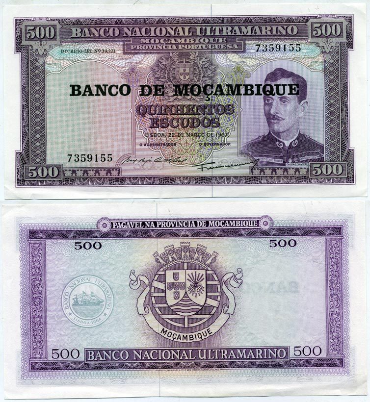 МОЗАМБИК ПОРТУГАЛЬСКИЙ 500 ЭСКУДО 1976 НАДПЕЧАТКА НА 1967, ПОРТРЕТ КАЛДАСА КСАВЬЕРА Pick 118а бумага 7548-24-1