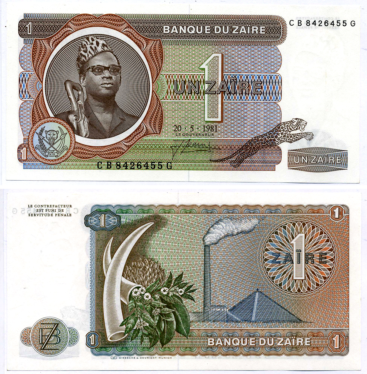 Заир 1 заир 1981 Мобуту Сесе Секо, бивни слона, фабрика Pick 19b бумага UNC (пресс) 7548-62-1-1