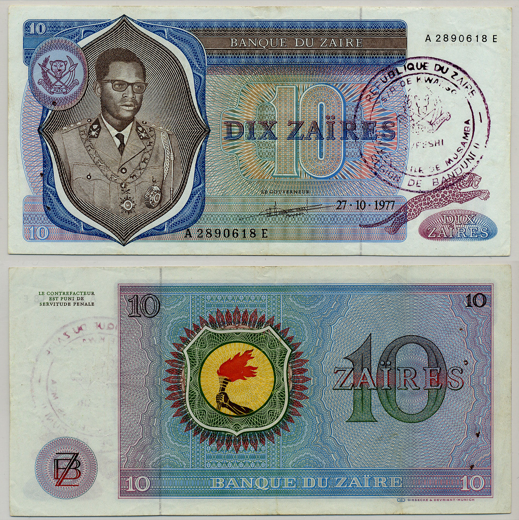 Заир 10 заиров 1977 Мобуту Сесе Секо, факел, регион БАНДЮНДЮ Pick 23b бумага 6279-40-1-1