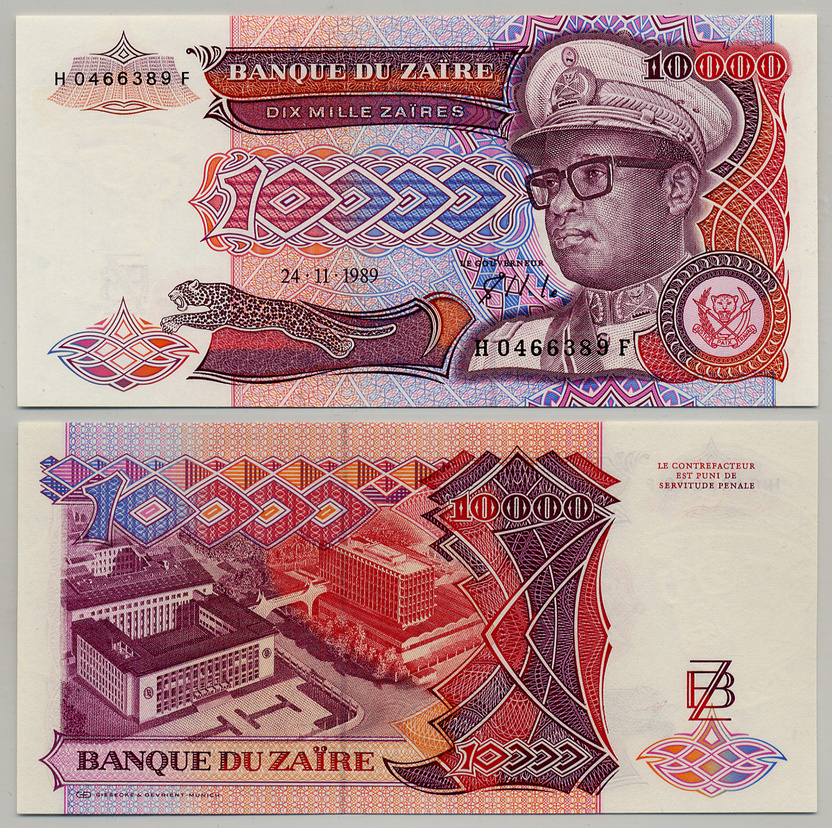Заир 10000 заир 1989 Мобуту Сесе Секо в военной форме, правительственный комплекс Pick 38 а бумага UNC (пресс) 6279-24-1-1