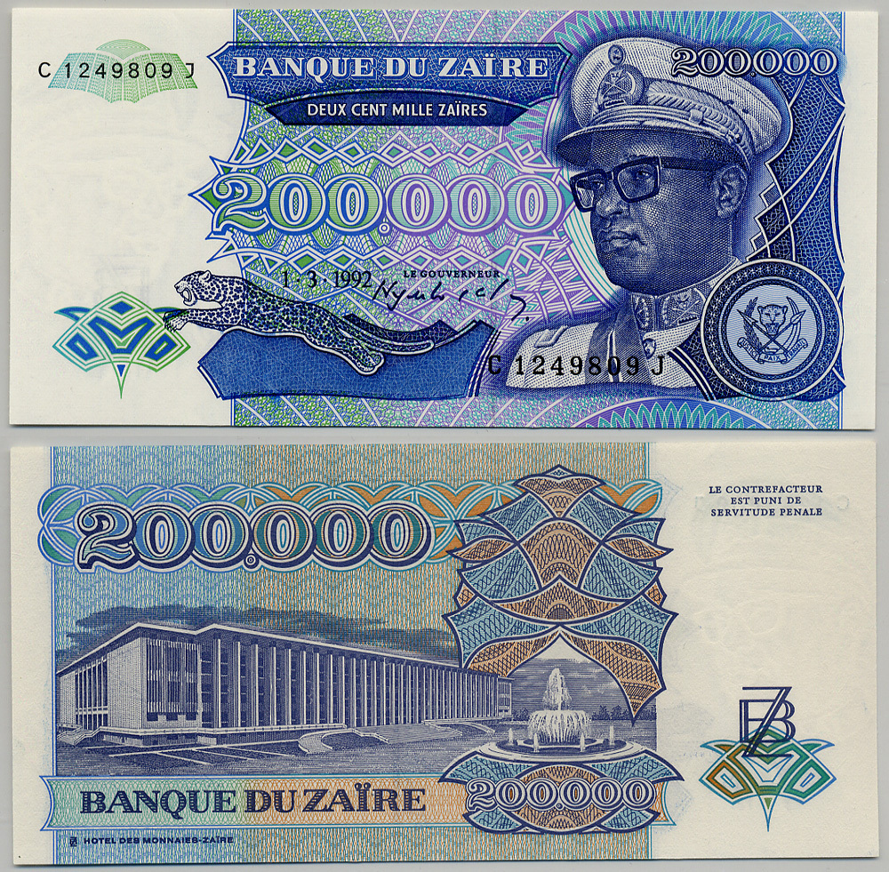 ЗАИР 200000 ЗАИРОВ 1992 1 МАРТА 1992, ПОДПИСЬ 8, КОРОЛЬ МОБУТУ В ВОЕННОЙ ФОРМЕ, HdMZ, ЗДАНИЕ С ФОНТАНОМ Pick 42a бумага UNC (ПРЕСС) 6279-26-1-1