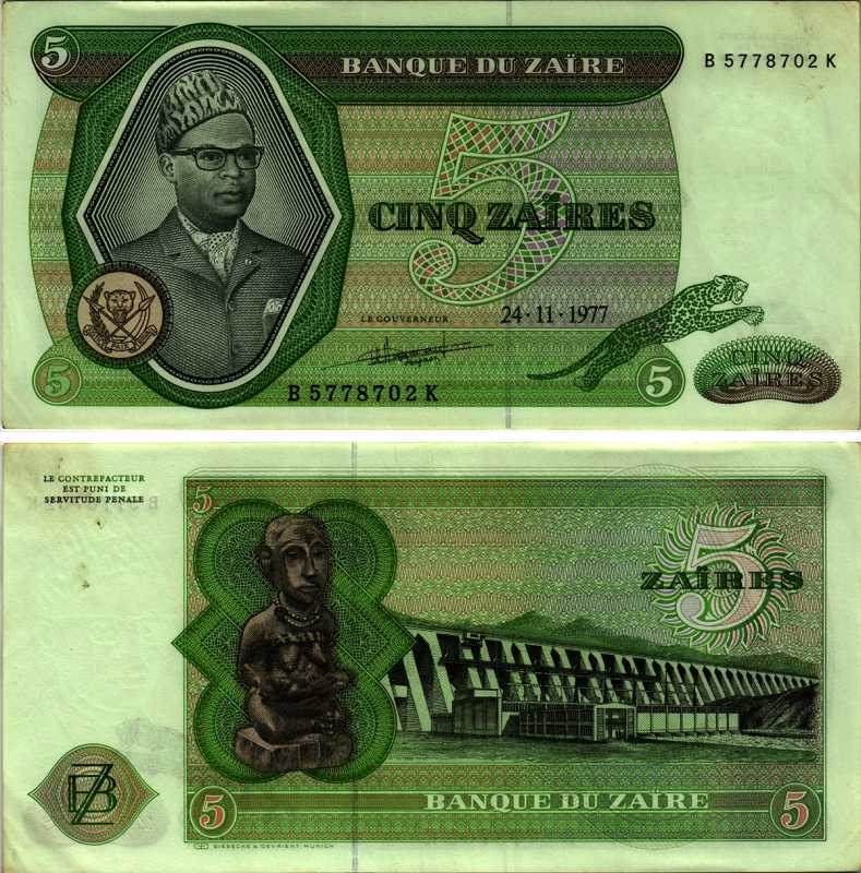 Заир 5 заиров 1977 Мобуту Сесе Секо, ГЭС "Инга" Pick 21 b бумага 7214-60-3-1