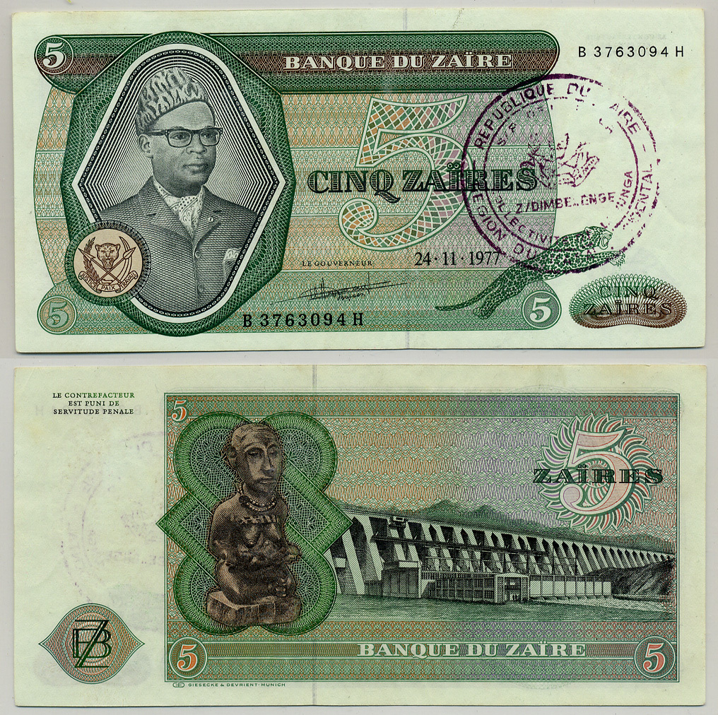 Заир 5 заиров 1977 Мобуту Сесе Секо, ГЭС "Инга", надпечатка, регион КАСАИ-ОКСИДАНТАЛЬ Pick 21b бумага 6279-42-2-1