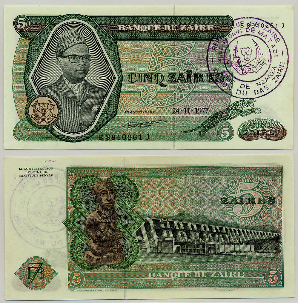 Заир 5 заиров 1977 Мобуту Сесе Секо, ГЭС "Инга", надпечатка, регион Нижний Заир, субрегион МАТАДИ, ЗОНА НЗАНЗА Pick 21b бумага aUNC 6279-39-2-1