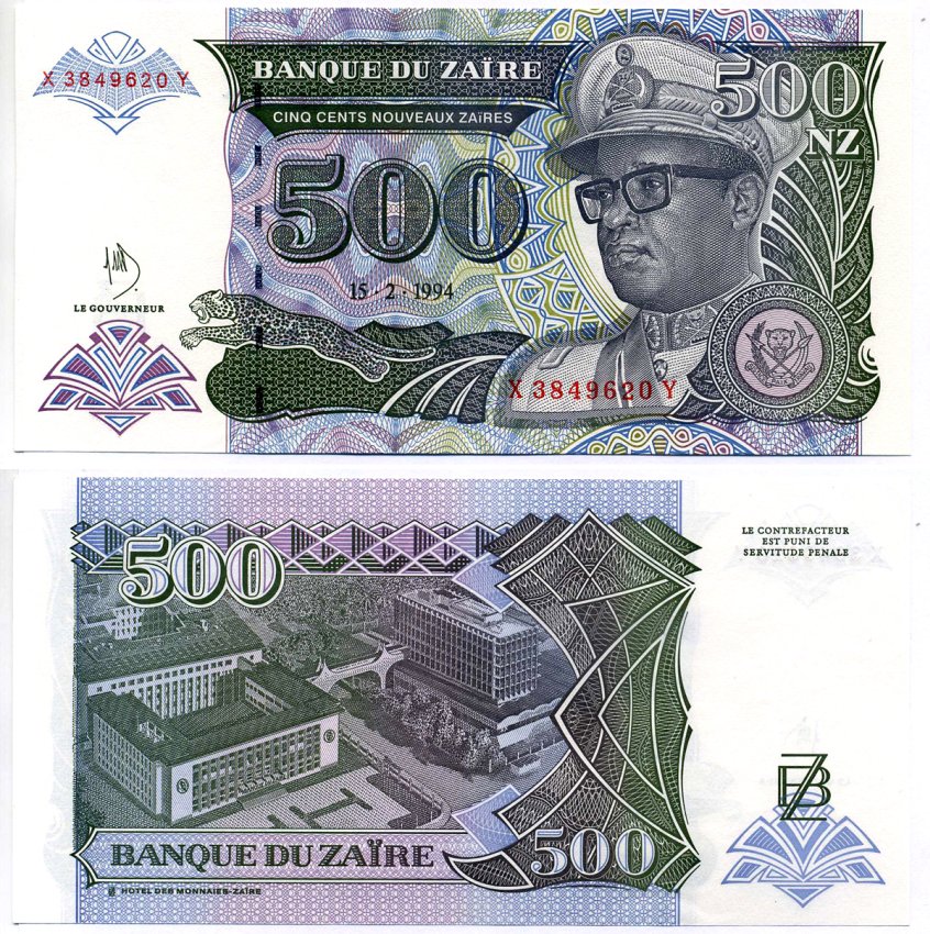 Заир 500 заиров 1994 Мобуту Сесе Секо в военной форме, Центральный банк в Киншасе, Hotel des Monnaies, серия X Pick 64A бумага UNC (пресс) 7523-25-1-2