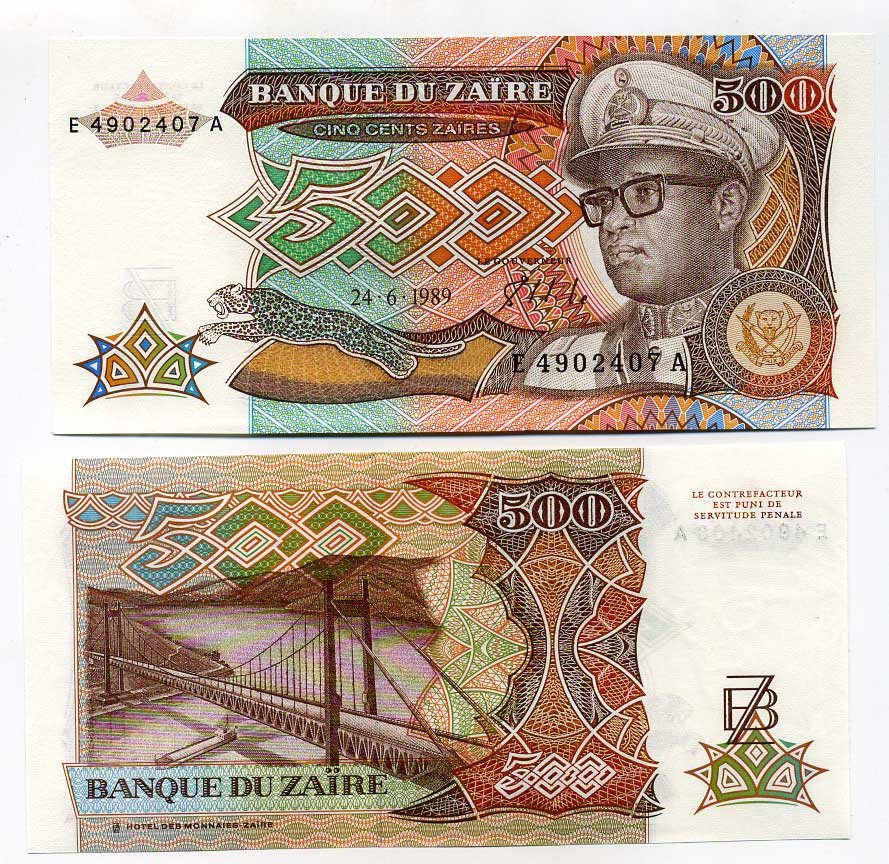 Заир 500 заиров 1989 Мобуту Сесе Секо в военной форме, мост через реку Конго Pick 34 а бумага UNC (пресс) 448-46-1