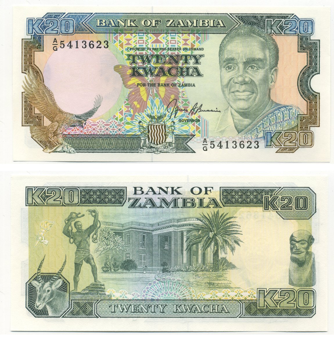 Замбия 20 квач ND (1989-1991) Кеннет Каунда, антилопа, президентский дворец, подпись Bussiere Pick 32 b бумага UNC (пресс) 7204-30-1