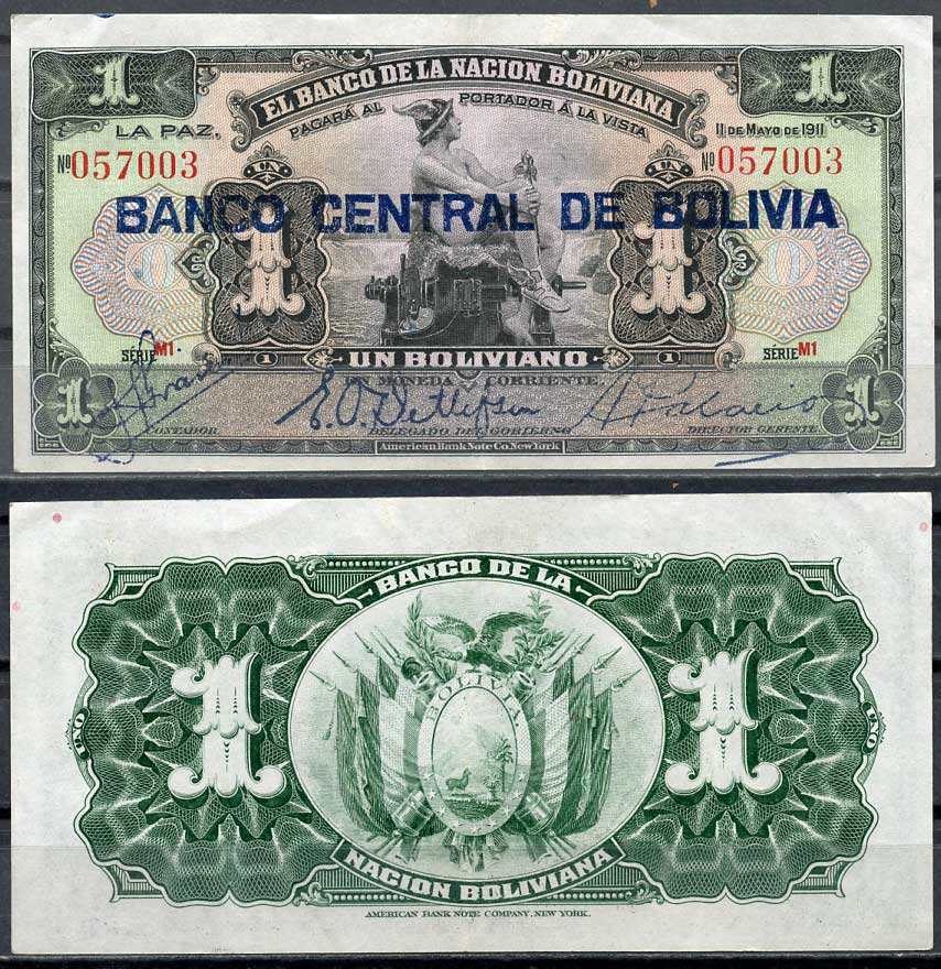 Боливия 1 боливиано 1911 (1929) надпечатка на Pick 103, серия M1, Меркурий Pick 112 (1) бумага 7217-61-2-1