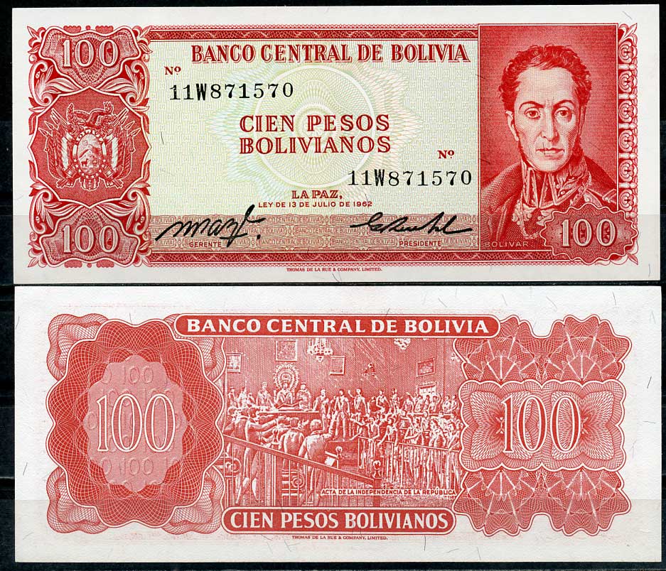Боливия 100 песо боливиано 1962 серия черная 11W, Симон Боливар, декларация независимости Pick 164 b (2) бумага UNC (пресс) 447-117-1