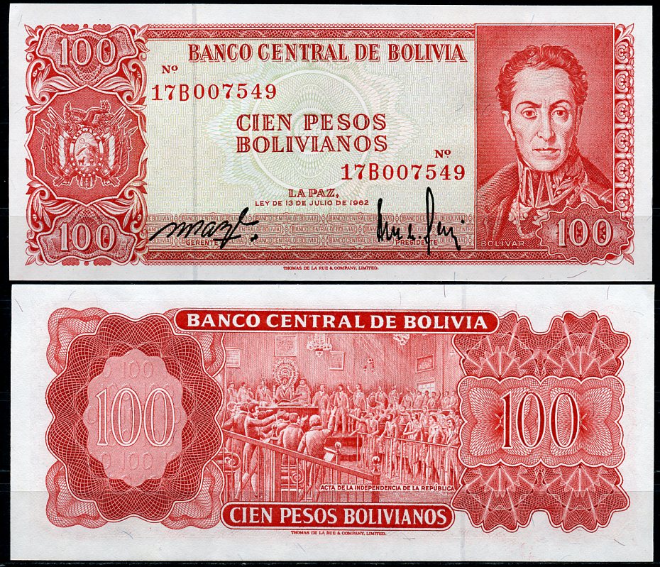 Боливия 100 песо боливиано 1962 серия красная 17B, Симон Боливар, декларация независимости Pick 164A (1) бумага UNC (пресс) 447-7-2