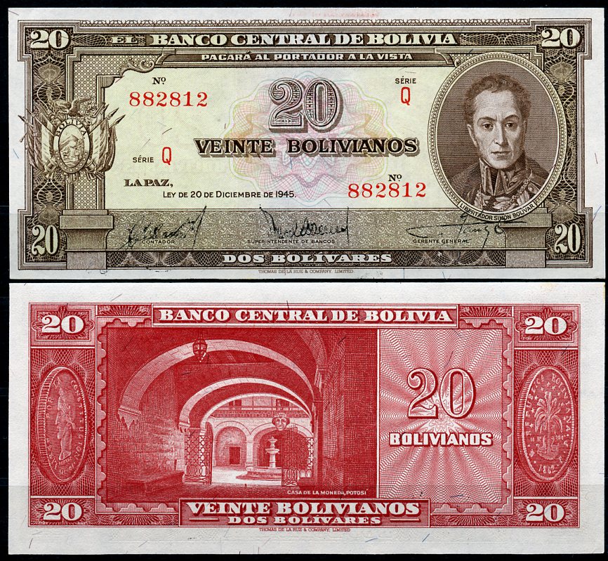 Боливия 20 боливиано 1945 серия Q, Симон Боливар, монетный двор, Потоси Pick 140 a (7) бумага UNC (пресс) 449-87-2