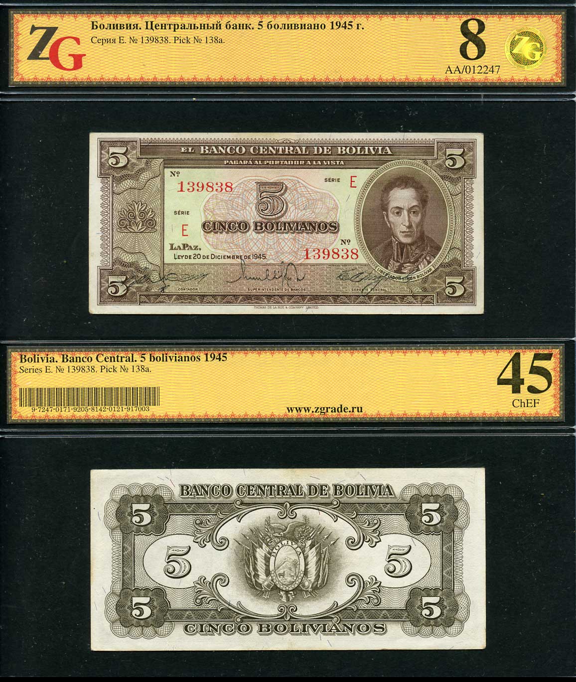 Боливия 5 боливиано 1945 Симон Боливар, в холдере компании ZG. Сохранность - 5 Pick 138 a бумага 452-1-91