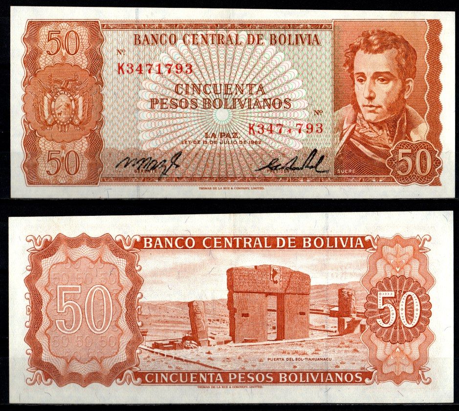Боливия 50 боливиано 1962 печать с браком, (непропечатана цифра в серийном номере) Pick 162 a (19) бумага 6280-43-2-2